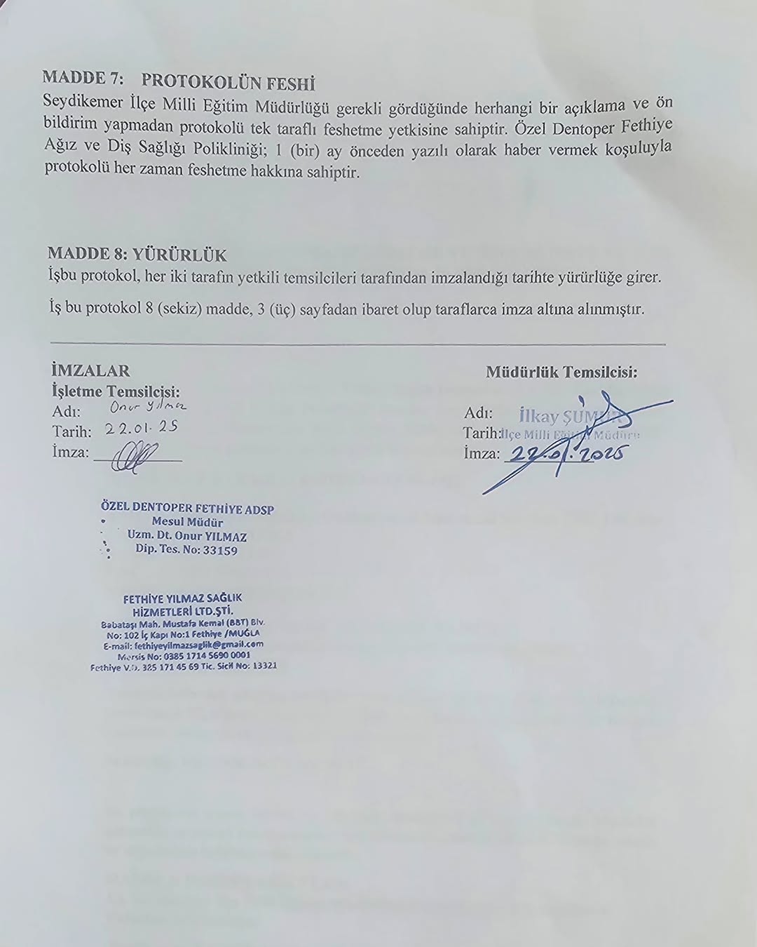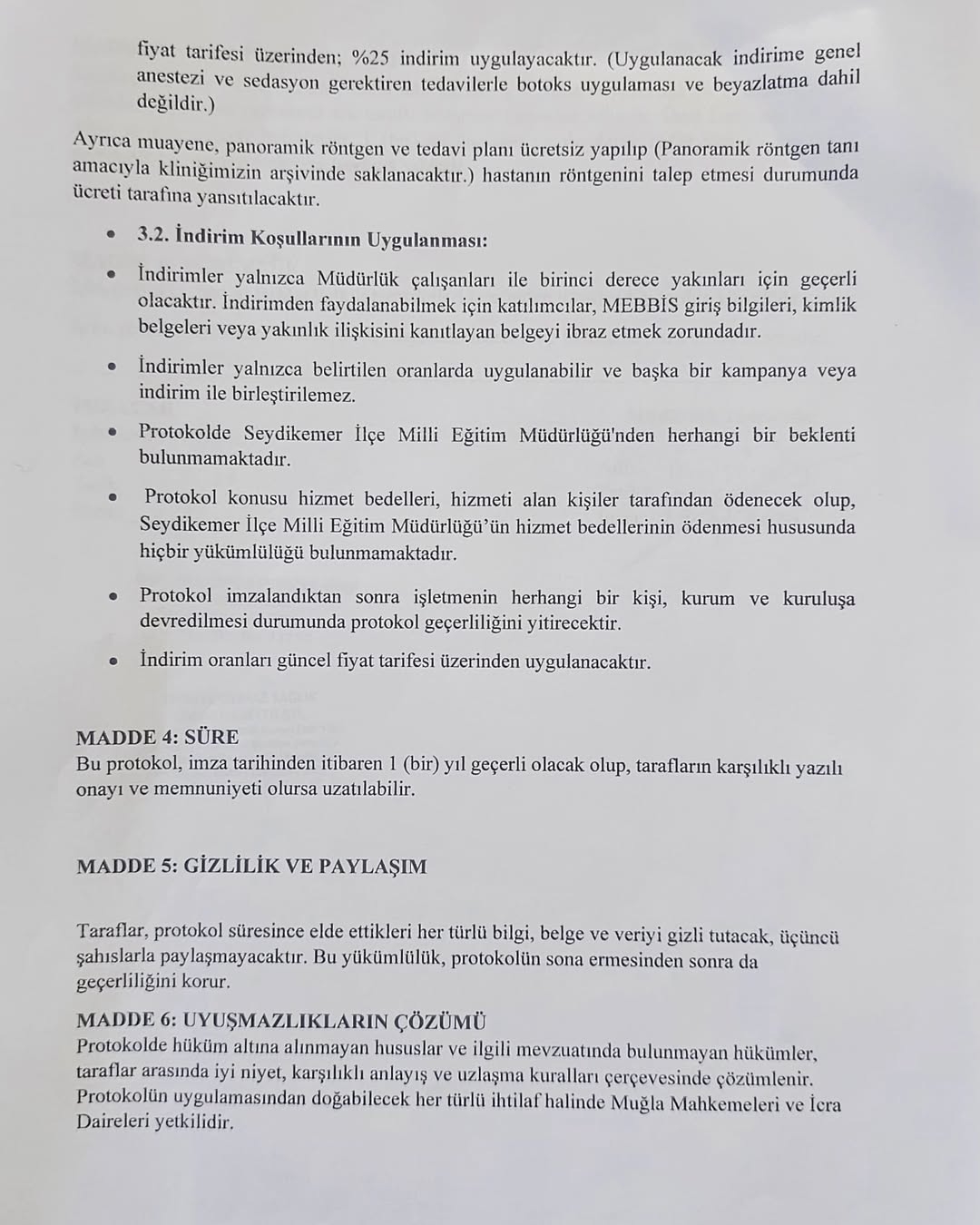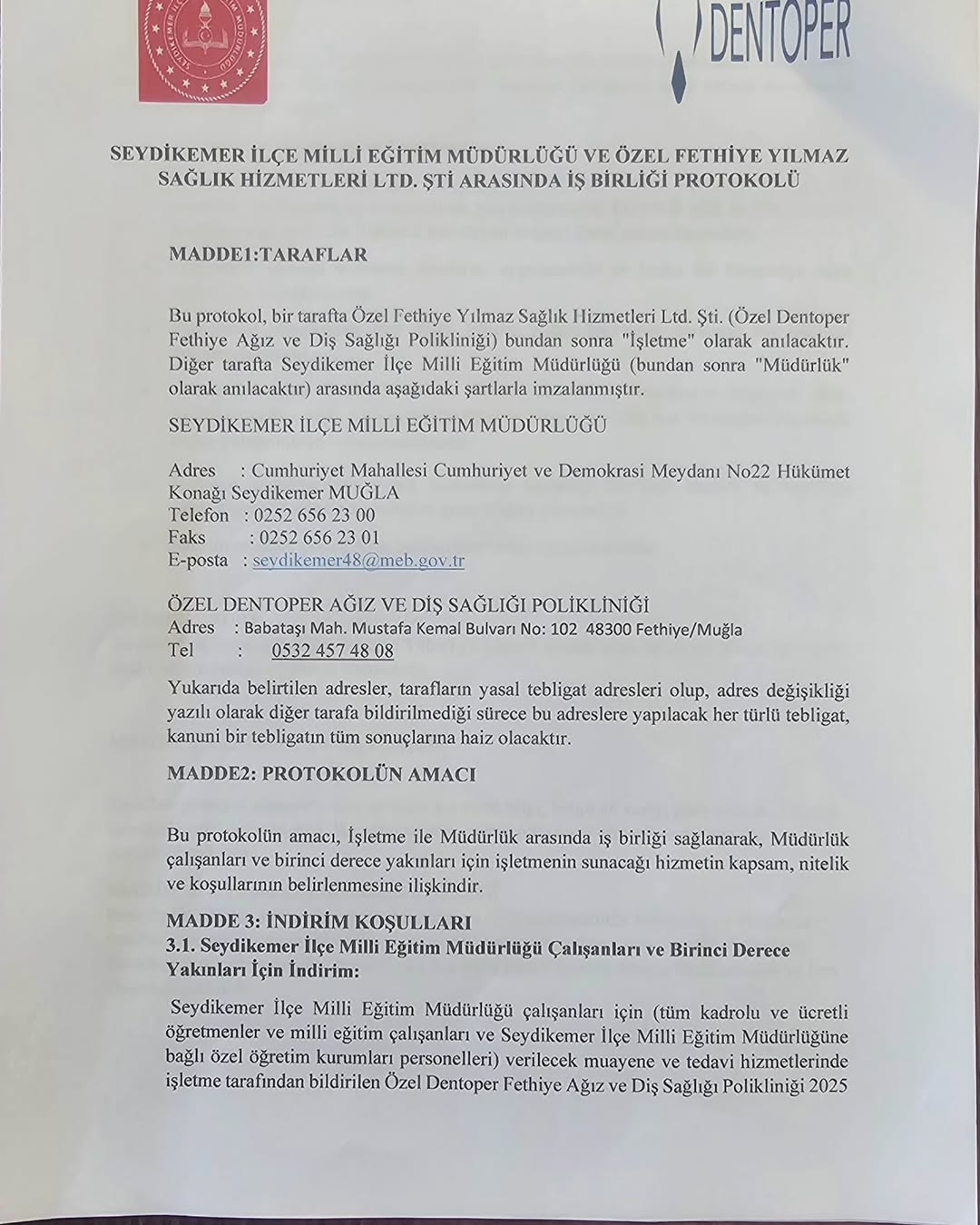 Seydikemer İlçe Milli Eğitim Müdürlüğü çalışanları için(tüm kadrolu ve ücretli öğretmenler ve milli eğitim çalışanları ve Seydikemer İlçe Milli Eğitim Müdürlüğüne bağlı özel öğretim kurumları personelleri) verilecek muayene ve tedavi hizmetlerinde işletme tarafından bildirilen Özel Dentoper Fethiye Ağız ve Diş Sağlığı Polikliğini 2025 fiyat tarifesi üzerinden; %25 indirim uygulanacaktır.(Uygulanacak indireme genel anestezi ve sedasyon gerektiren tedavilerle botoks uygulaması ve beyazlatma dahil değildir.)