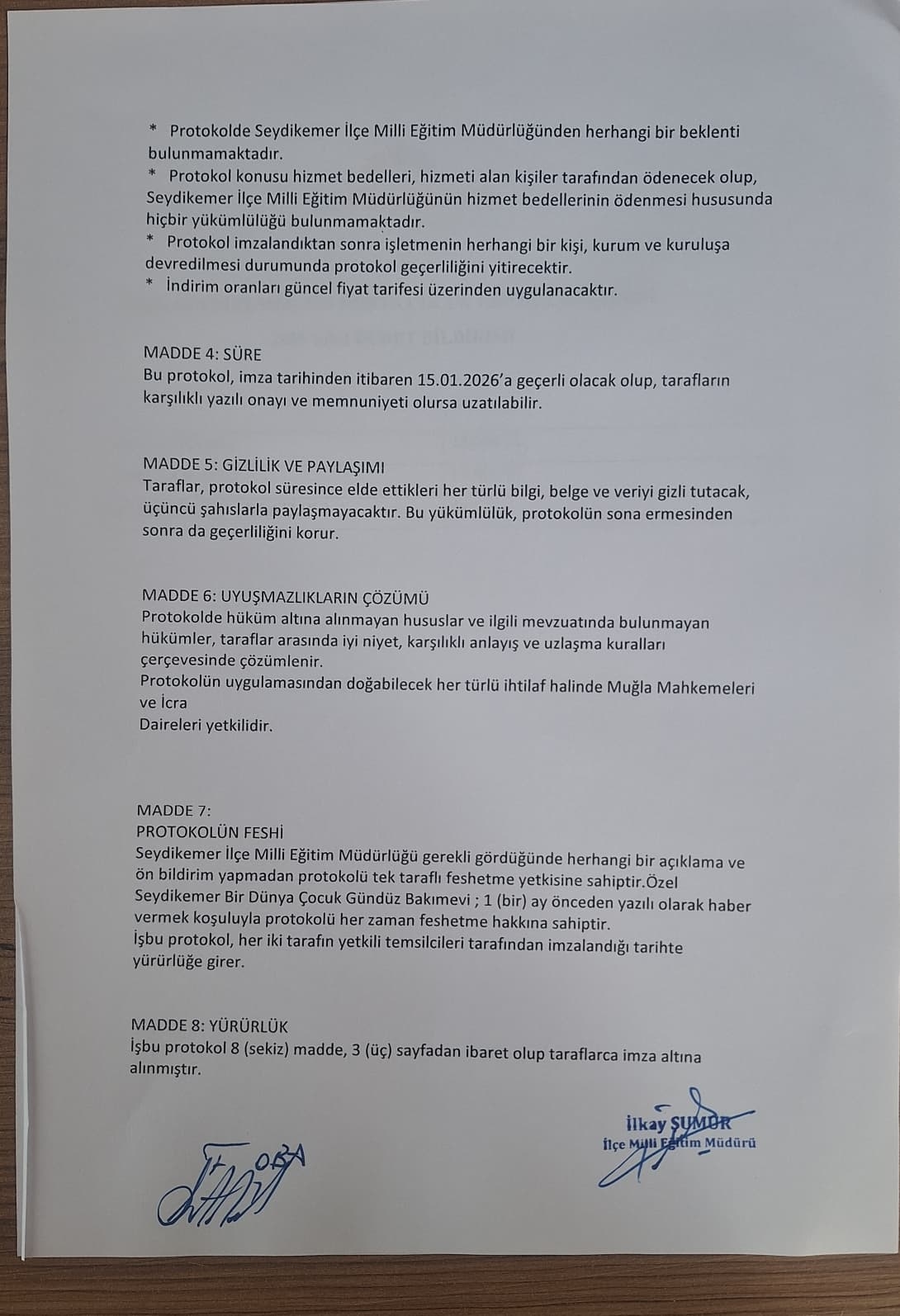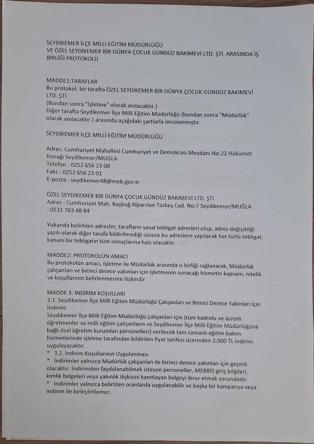 Seydikemer İlçe Millî Eğitim Müdürlüğü ile Özel Seydikemer Bir Dünya Çocuk Gündüz Bakımevi arasında, kurum çalışanları ve birinci derece yakınlarına yönelik indirimli hizmet sunulmasına ilişkin iş birliği protokolü imzalandı.